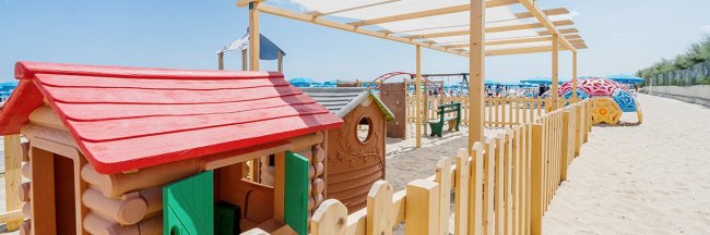 Spiaggia con giochi colorati e ombrelloni blu.